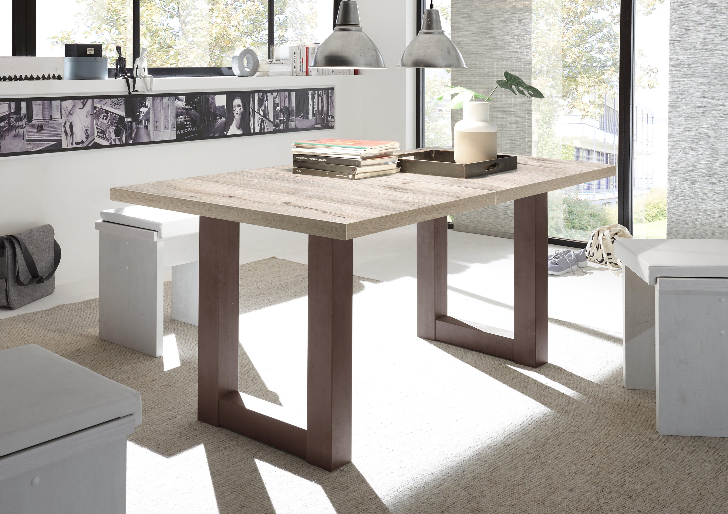 1 ausziehbarer esstisch und 4 stühle.
