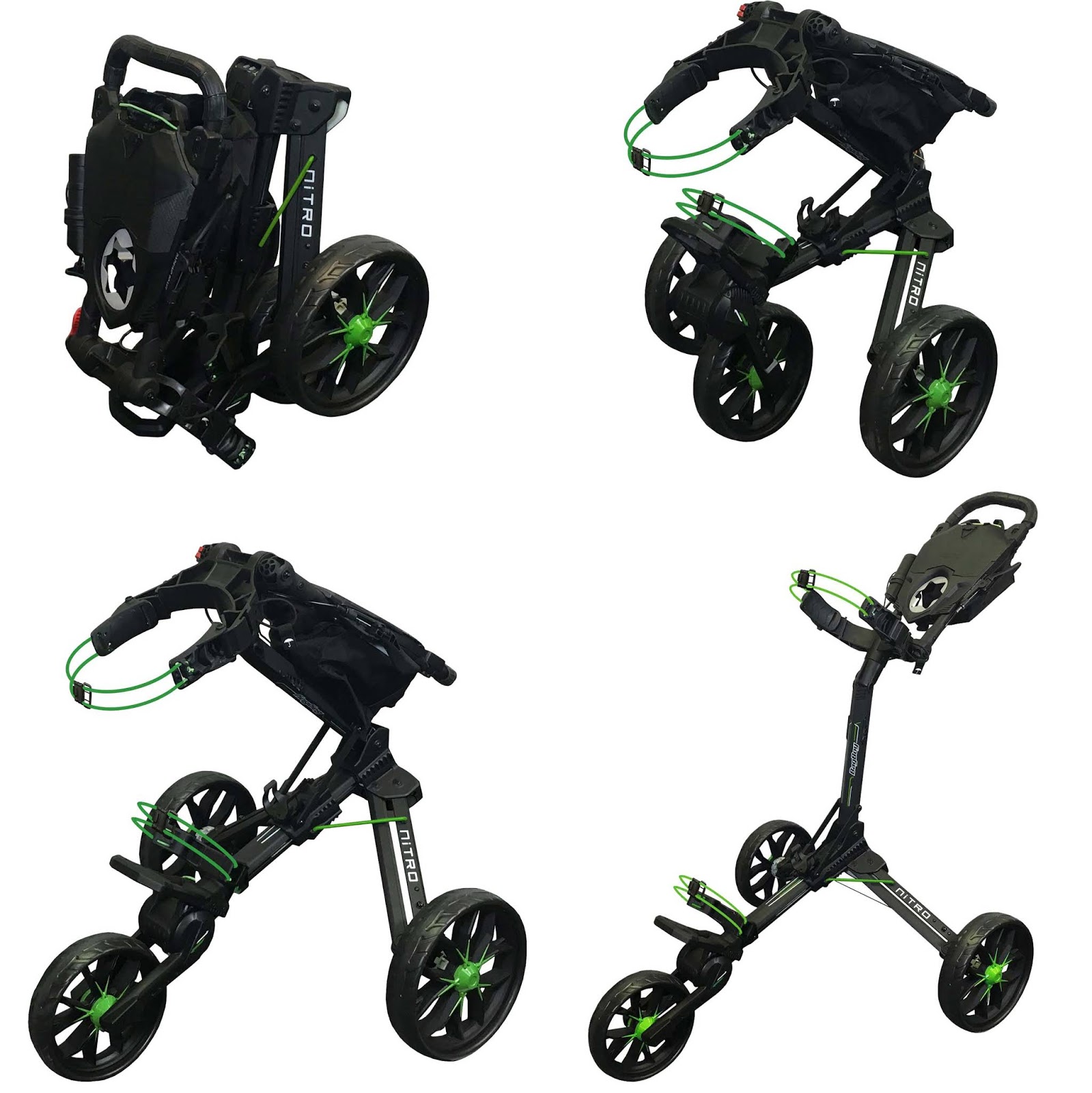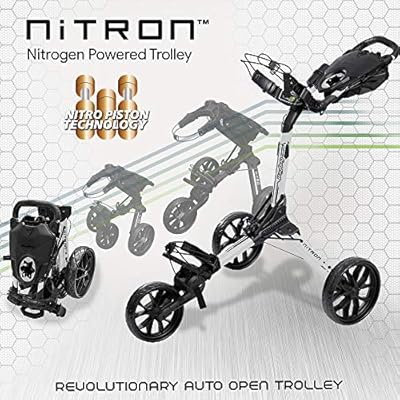 Bag boy nitron auto open push cart featuring nitro piston technology a patented nitrogen powered auto assist open mechanism opens and folds in seconds featuring top lok technology a patented bag to cart attachment system the prevents twisting and turning.